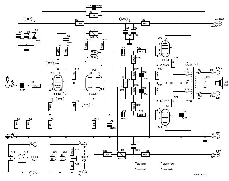 - Deze buizen eindtrap die door de auteur de naam 'Straighgt' heeft meegekregen, is een ontwerp met twee EL34's in balansschakeling. Het vermogen ligt ruimschoots boven de 35W bij een lage vervorming en een brede frequentiekarakteristiek. In combinatie met een paar goede luidsprekerboxen met een redelijk rendement is een uitstekende weergavekwaliteit mogelijk. Dan blijkt zelfs dat een dergelijk simpel ontwerp met vrij conventionele specificaties ons bij sommige muziekpassages de rillingen over de rug doen lopen.